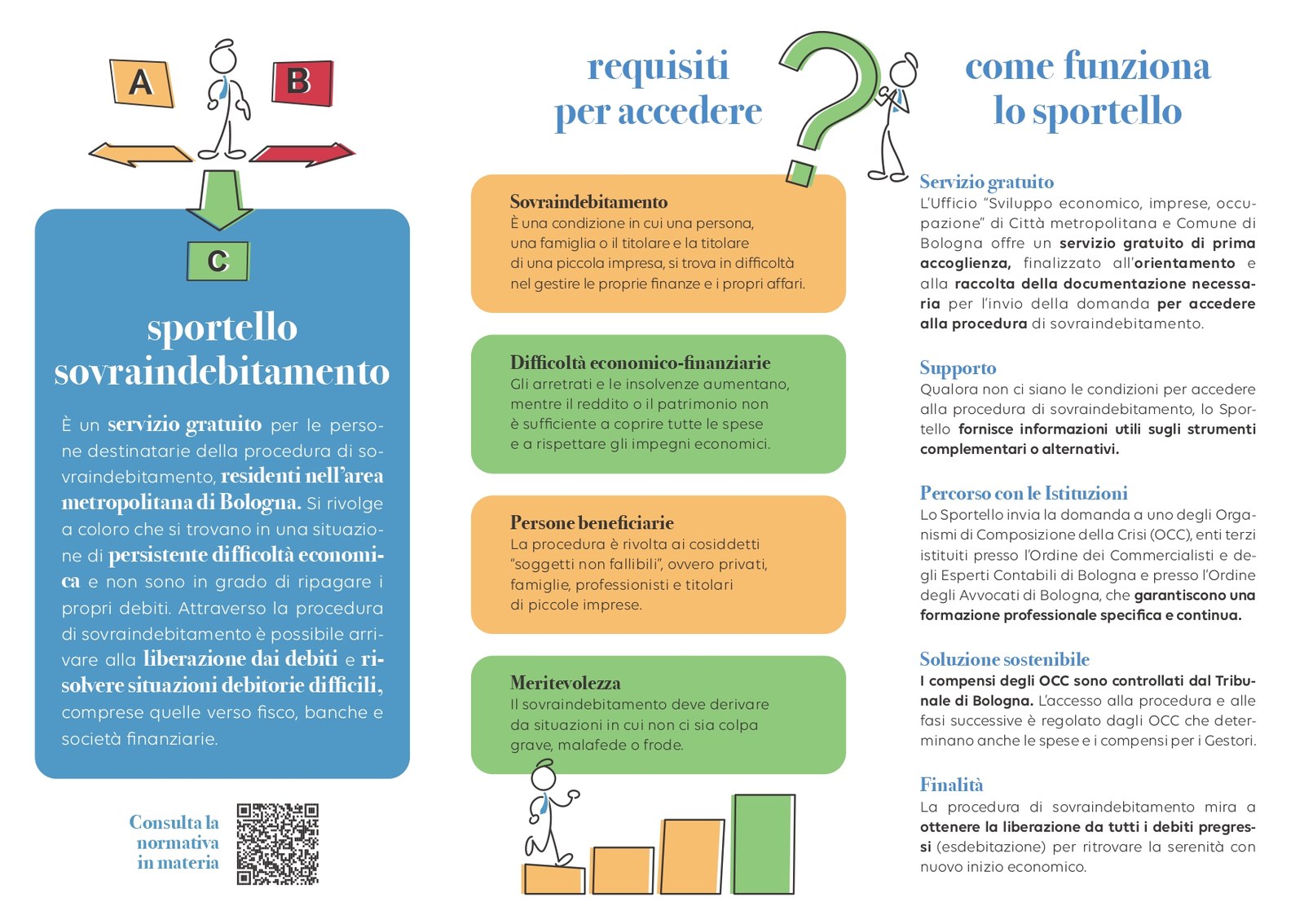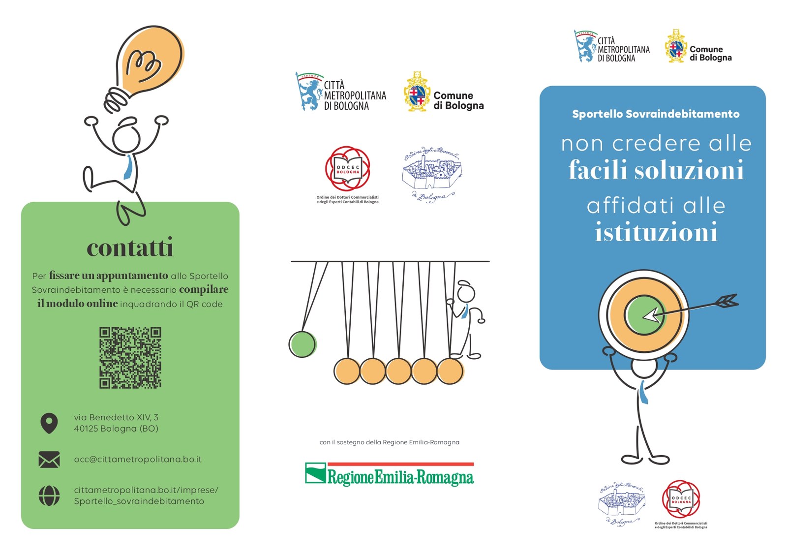 Questo servizio, realizzato in collaborazione con l’Ordine dei Dottori Commercialisti e degli Esperti Contabili di Bologna e l’Ordine degli Avvocati di Bologna, offre un sostegno gratuito e qualificato ai cittadini residenti nell’area Metropolitana di Bologna in difficoltà. Si rivolge a tutti coloro che si trovano in una situazione di persistente difficoltà economica e non sono in grado di ripagare i propri debiti. Attraverso la procedura di sovraindebitamento è possibile arrivare alla liberazione dai debiti e risolvere situazioni debitorie difficili, comprese quelle verso fisco, banche e società finanziarie.