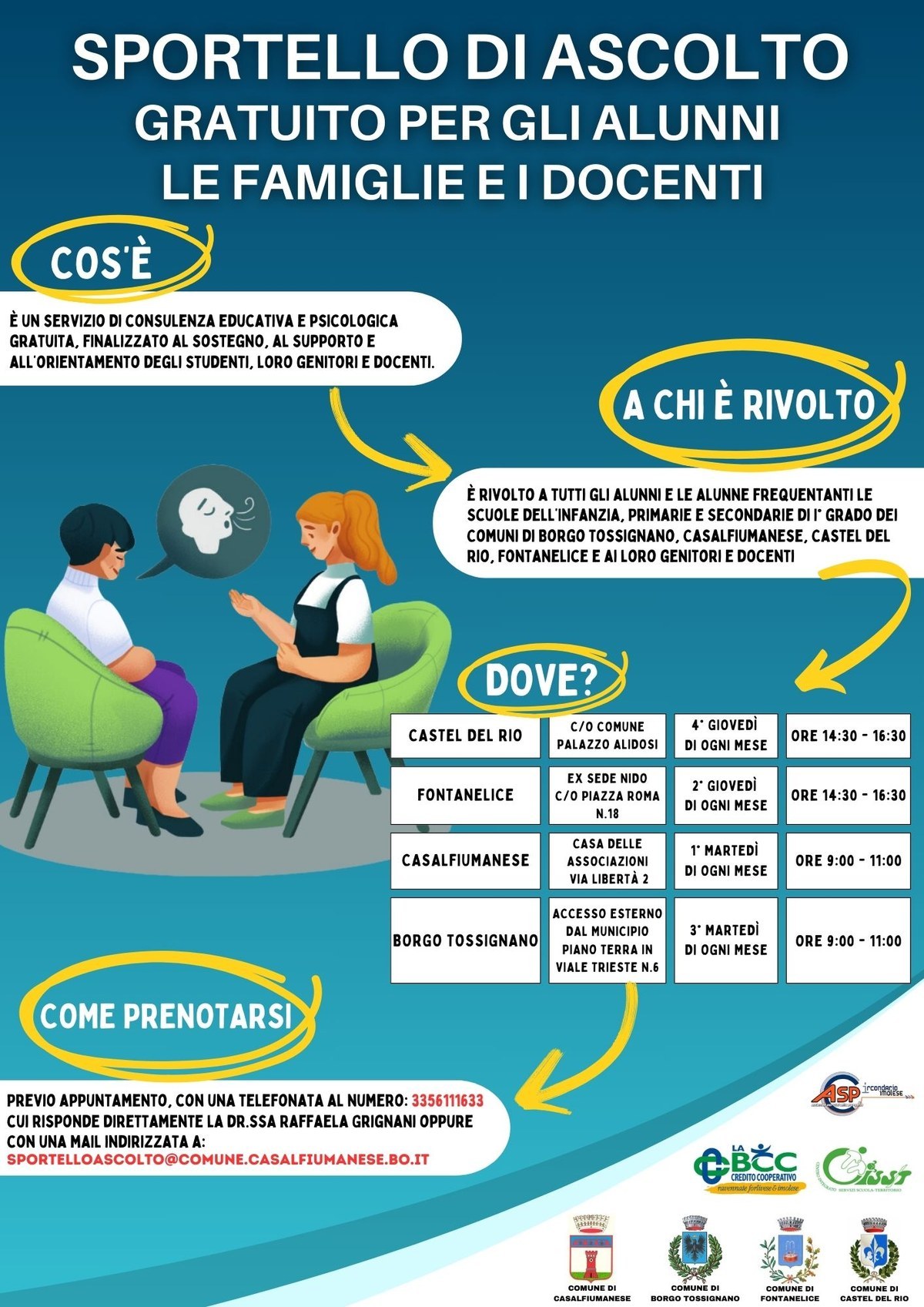 Il 15 settembre, in parallelo al riavvio dell’annata scolastica 2025-2026, riparte anche l’attività dello ‘Sportello di Ascolto’ gratuito per le famiglie, gli alunni e i docenti delle scuole di ogni ordine e grado dei Comuni di Casalfiumanese, Borgo Tossignano, Fontanelice e Castel del Rio.