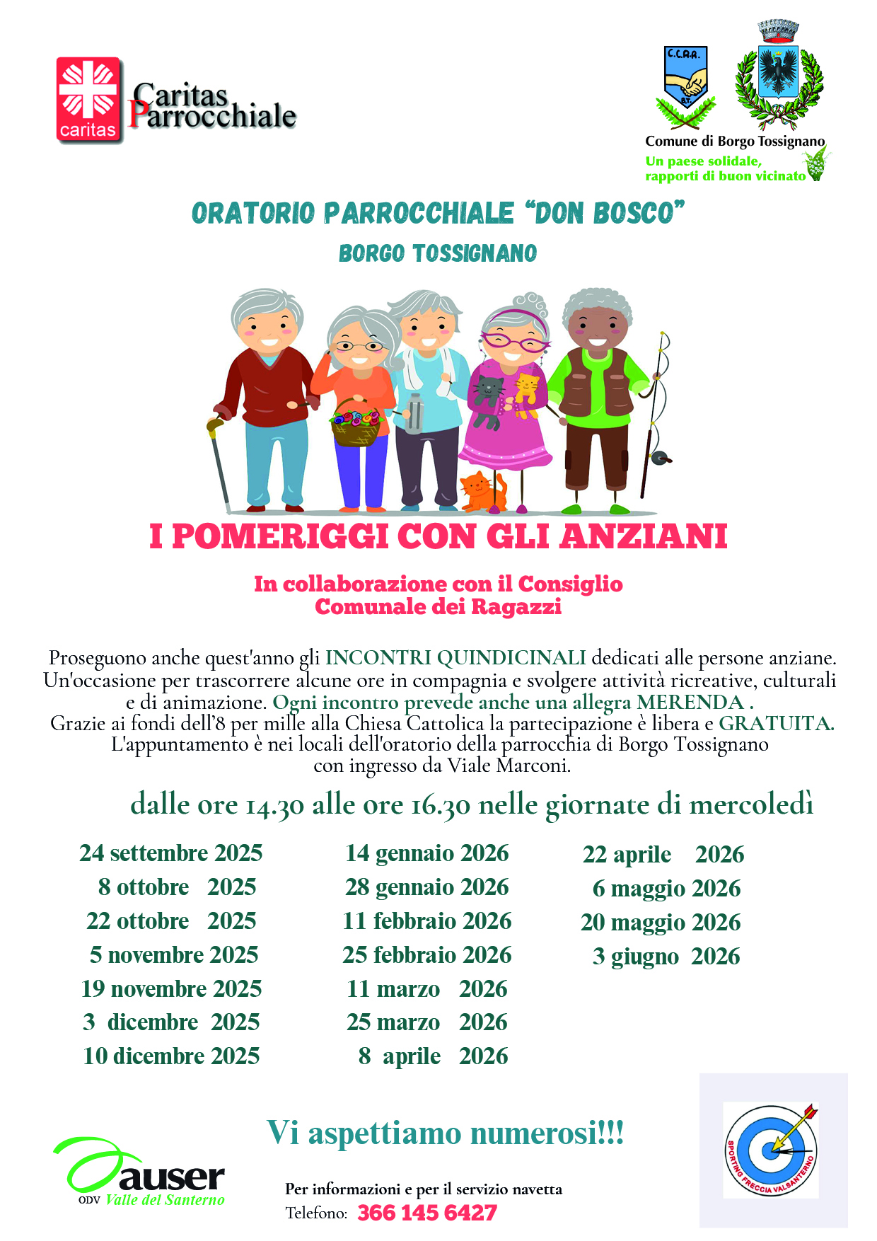 Proseguono anche quest'anno gli incontri quindicinali dedicati alle persone anziane, per cui il comune di Borgo Tossignano con la collaborazione dell'Auser Valle del Sanerno, della Caritas Parrocchiale Centro di Ascolto e dello Sporting Valsanterno
