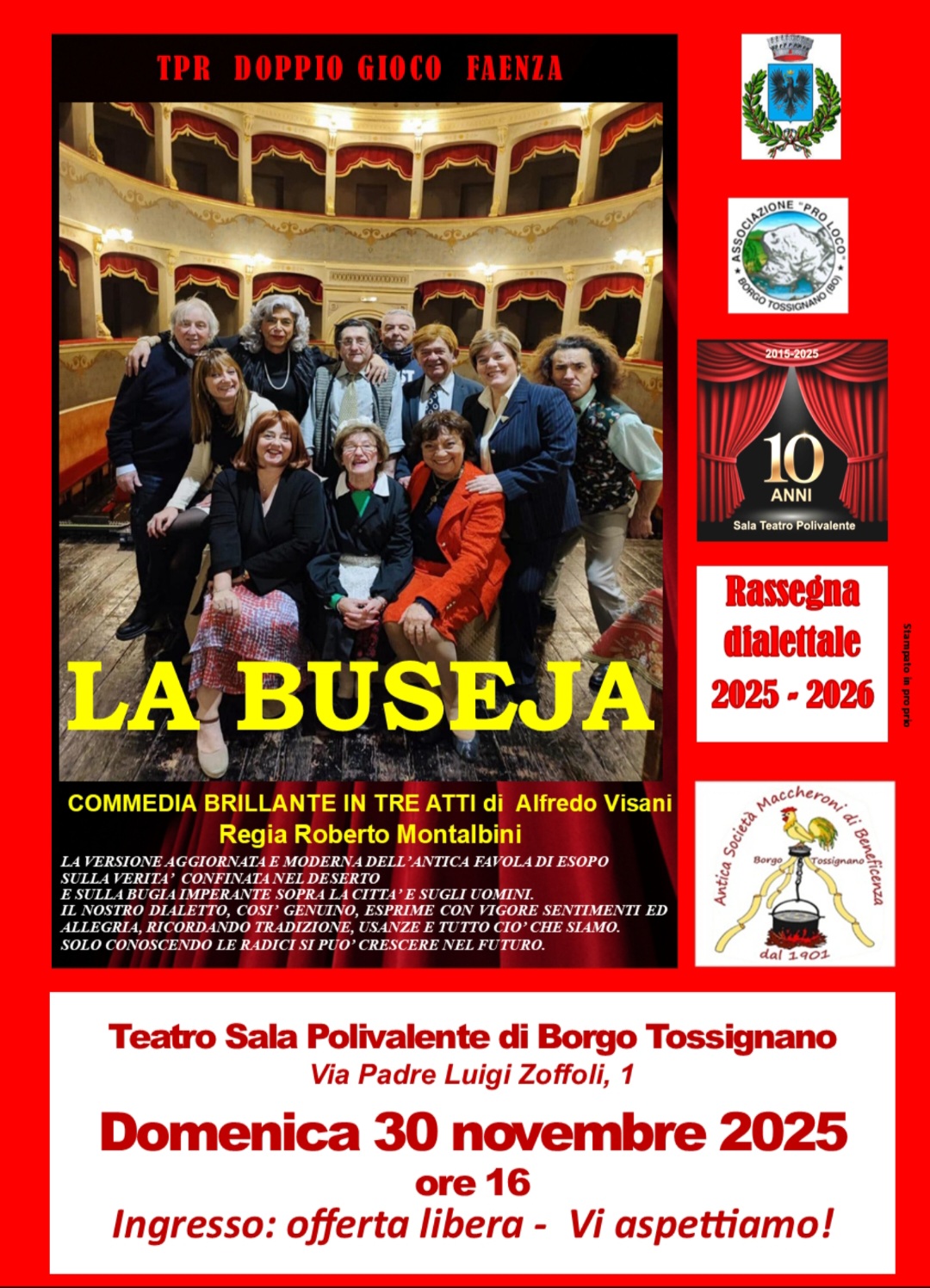A cura dell'Antica Società Maccheroni di Beneficenza, dell'Associazione Pro Loco di Borgo Tossignano e dell'Amministrazione comunale, domenica 30 novembre alle ore 16 presso la Sala Teatro Polivalente di Borgo Tossignano, nell'ambito della Rassegna Dialettale 2025-2026 si svolgerà