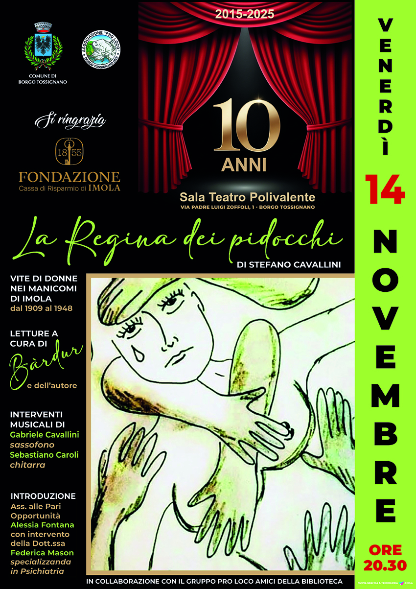 Venerdì 14 novembre 2025 alle ore 20:30 presso la Sala Teatro Polivalente, l'Amministrazione comunale, l'Associazione Pro Loco di Borgo Tossignano in collaborazione con il gruppo Pro Loco Amici della Biblioteca, in occasione del decennale della Sala Teatro Polivalente vi invitano allo spettacolo