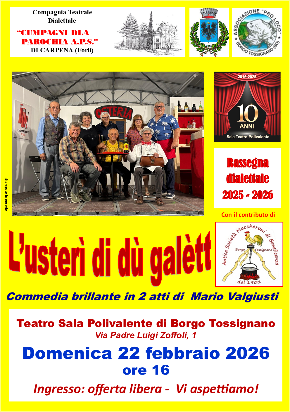 A cura dell'Antica Società Maccheroni di Beneficenza, dell'Associazione Pro Loco di Borgo Tossignano e dell'Amministrazione comunale, domenica 22 febbraio 2026 alle ore 16 presso la Sala Teatro Polivalente di Borgo Tossignano, nell'ambito della Rassegna Dialettale 2025-2026 si svolgerà